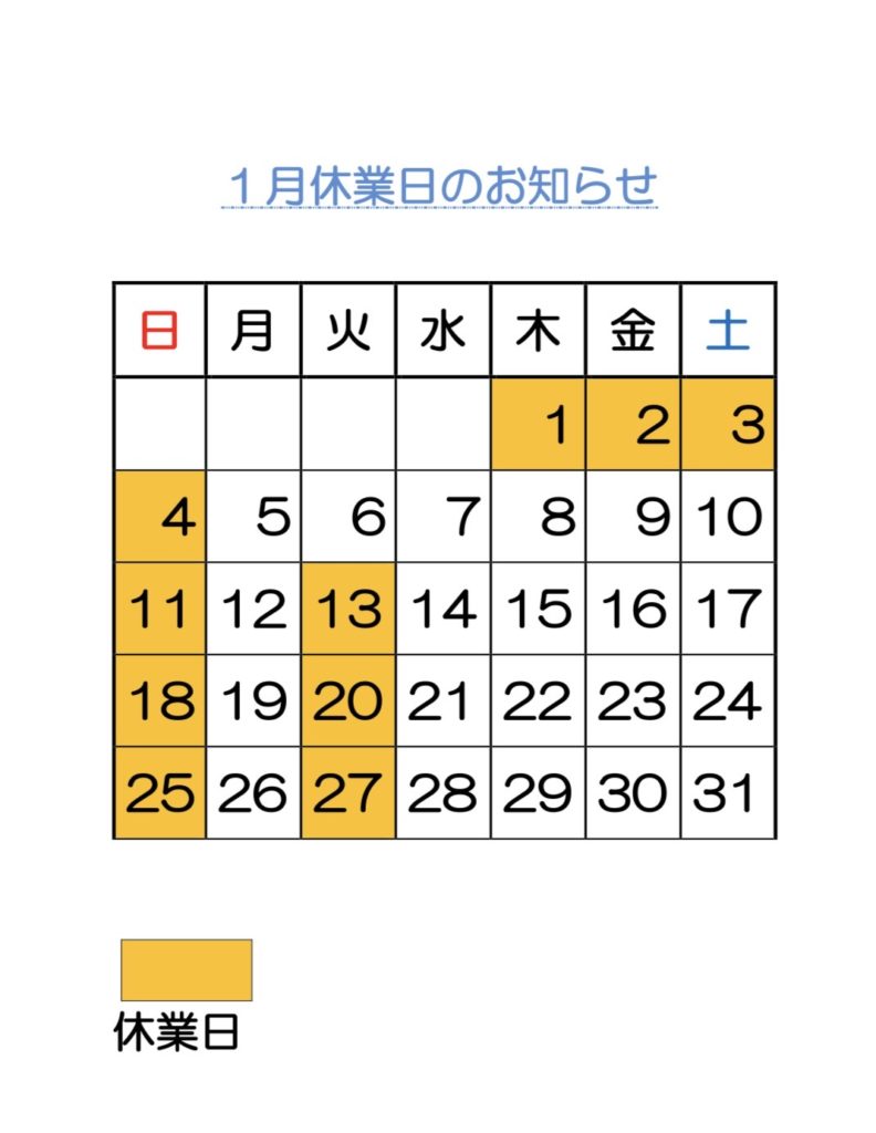 年明け1月の定休日をお知らせいたします。